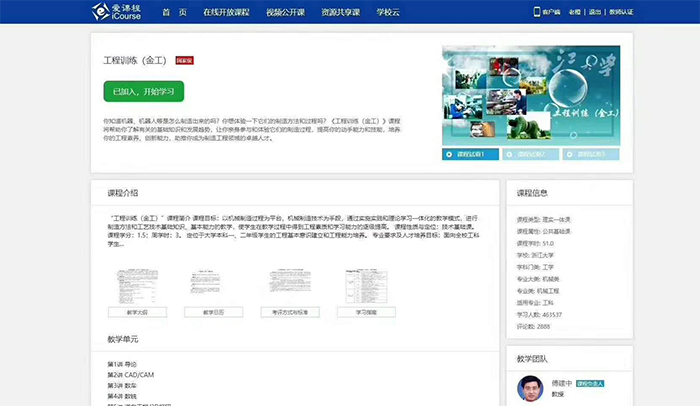 浙江大學傅建中老師【教授、博導、國家級教學示范中心主任、中組部“萬人計劃”創新創業人才,國家科技部科技創新創業領軍人才,浙江省優秀科技工作者】主持的國家級精品資源共享課“工程訓練(金工)”上線“愛課程網”累計已有近50萬學習人數。