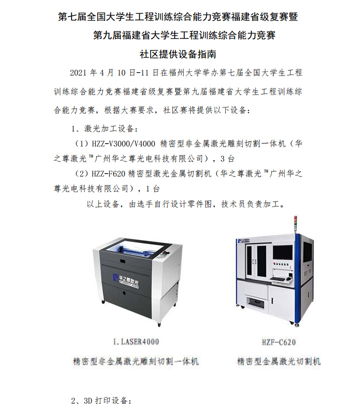 4月10日,第七屆全國大學生工程訓練綜合能力競賽福建省級復賽暨第九屆福建省大學生工程訓練綜合能力競賽在福州大學開賽啦!!!本屆大賽主題——“守德崇勞工程創新求卓越,服務社會智造強國勇擔當”。華之尊激光榮幸受邀成為本次大賽激光加工設備唯一供應商。為大賽提供激光加工設備和激光加工技術支持。