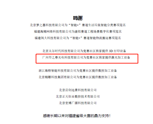 感謝福建省大學生工程訓練綜合能力競賽組委會的信任,從廈門理工開始、廈門大學嘉庚學院、莆田學院,再到今年的福州大學,已連續多年使用我司金屬、非金屬激光設備做為獨家激光加工設備,我們一定不負所托,為大賽保駕護航。